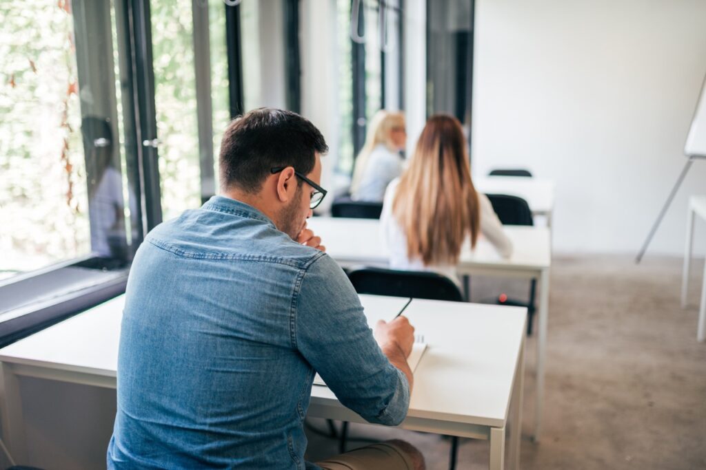 Happy male student with a confident beaming smile sitting working on paperwork in the classroom in front of a chalkboard