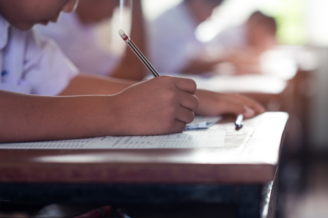 Group of multi ethnic high school students having test at classroom